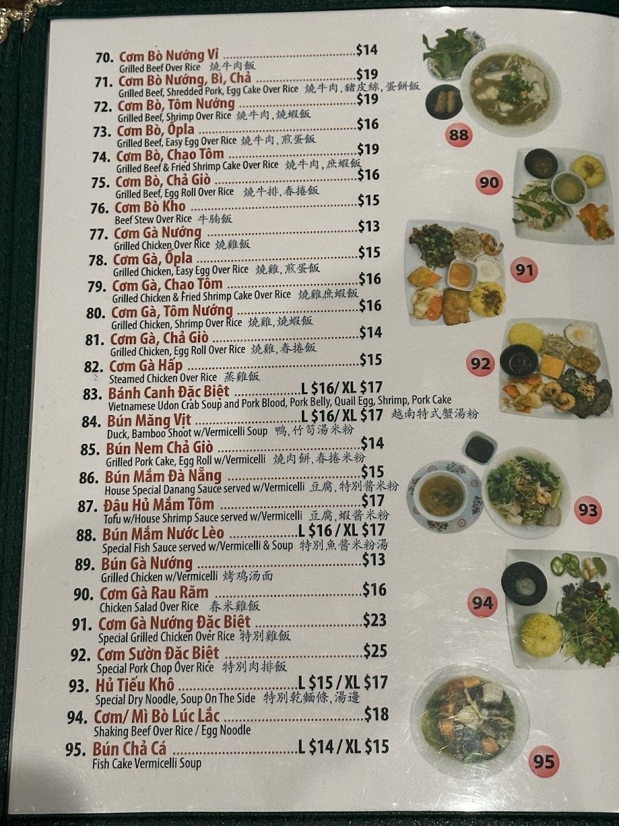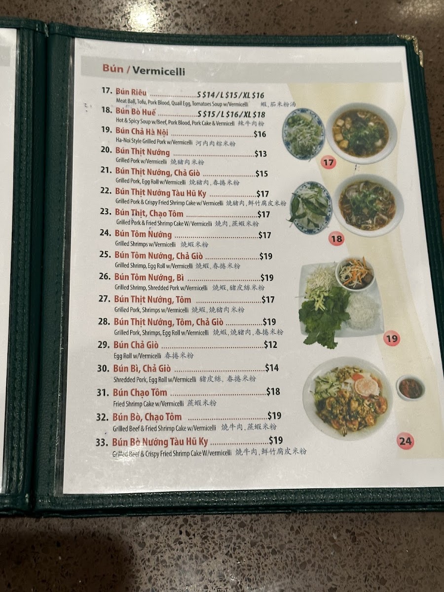 - Appetizers and Rolls: The menu highlights several types of rolls including egg rolls, spring rolls, veggie egg rolls served with lettuce, grilled pork rolls, and Bun Cha Gio, allowing for lighter or complementary dishes to the main courses.
