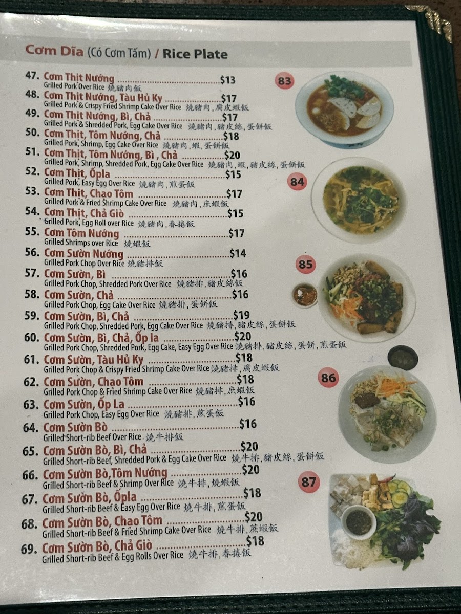 - Rice Plates (Cơm Dĩa): The rice plate selection features grilled pork served alone or combined with other proteins such as crispy fried shrimp cake, shredded pork, egg cake, and shrimp, providing hearty meal options.