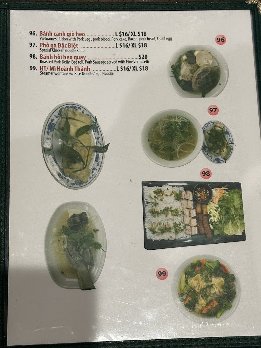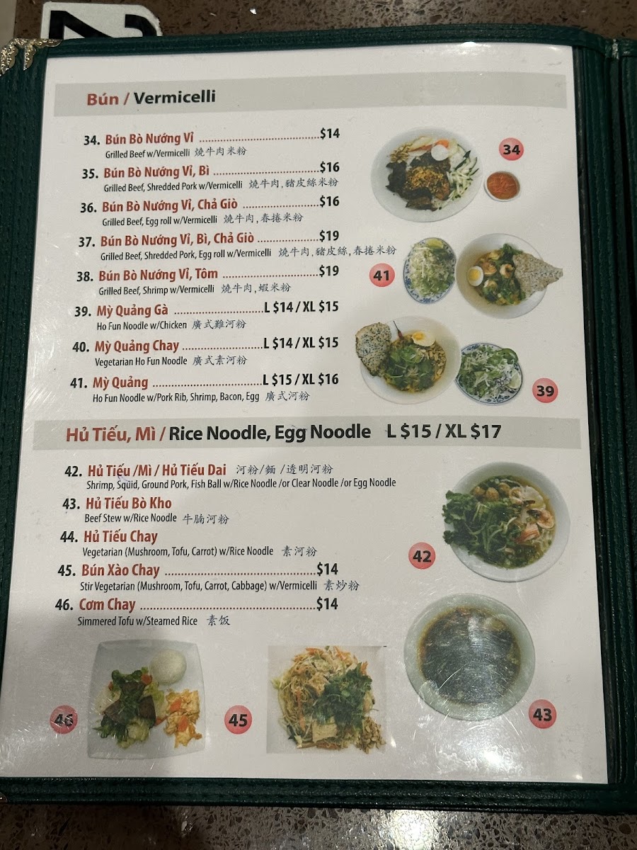 - Noodle Dishes (Hủ Tiếu, Mì): Various noodle soups and noodle bowls are offered, including options with rice noodles, egg noodles, or clear noodles. Popular items include shrimp, squid, ground pork, fish balls, beef stew, and vegetarian versions with mushrooms and tofu.