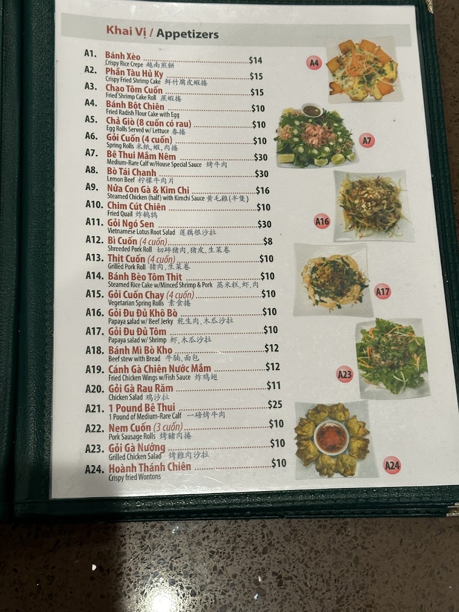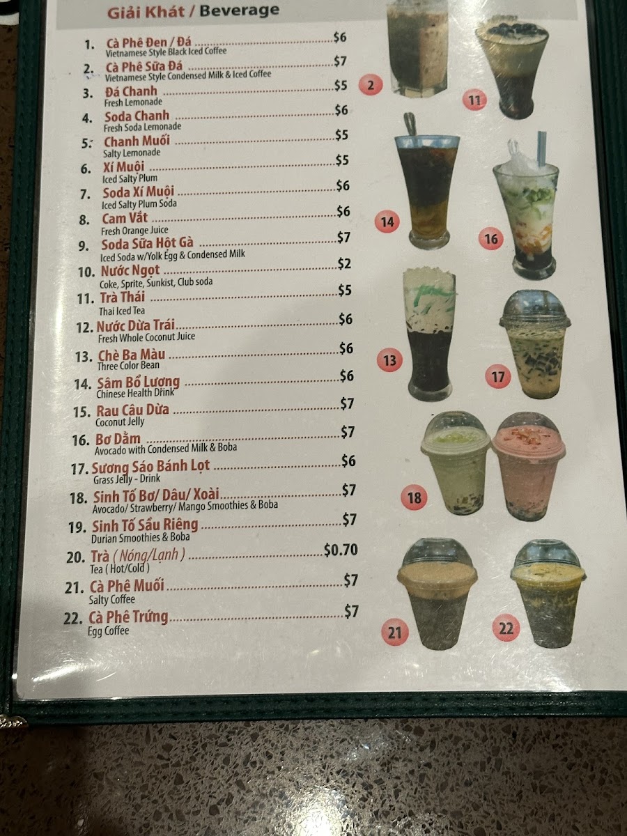 - Beverages: This section includes classic Vietnamese drinks such as black iced coffee (Cà Phê Đen), condensed milk iced coffee (Cà Phê Sữa Đá), fresh lemonade, salt lemonade, and various sodas infused with flavors like salty plum. Hot teas and iced Thai tea are also available to complement the meal.